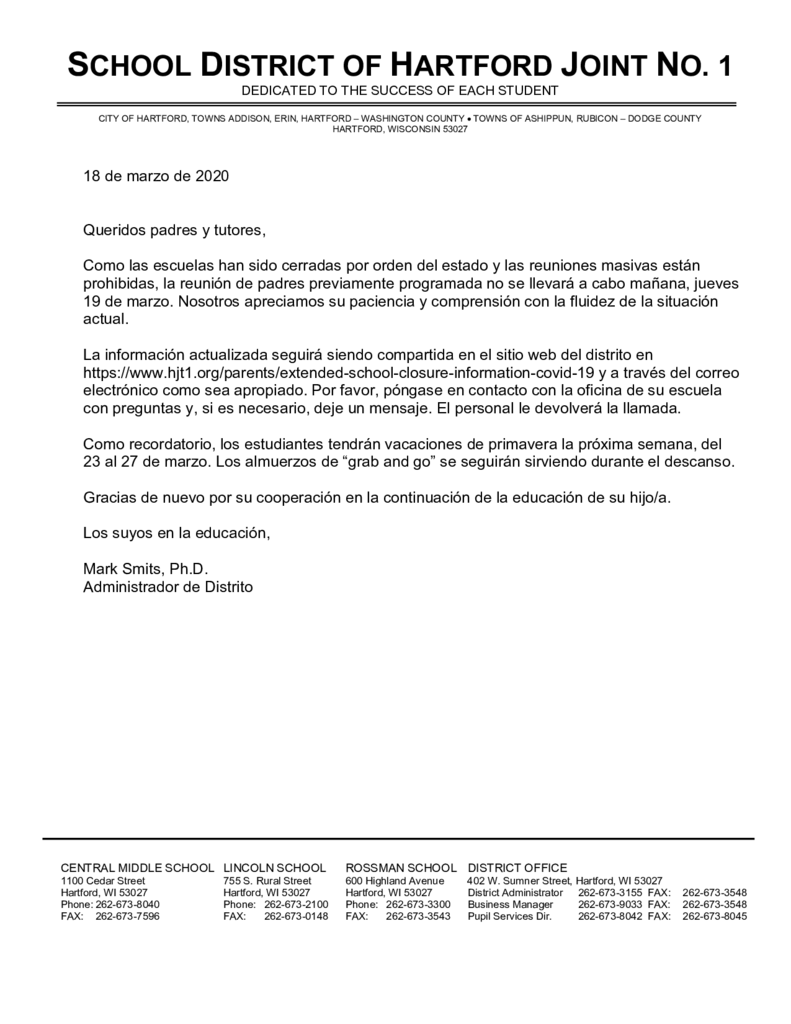 Extended School Closure Update Letter (3/18/2020) - Spanish
