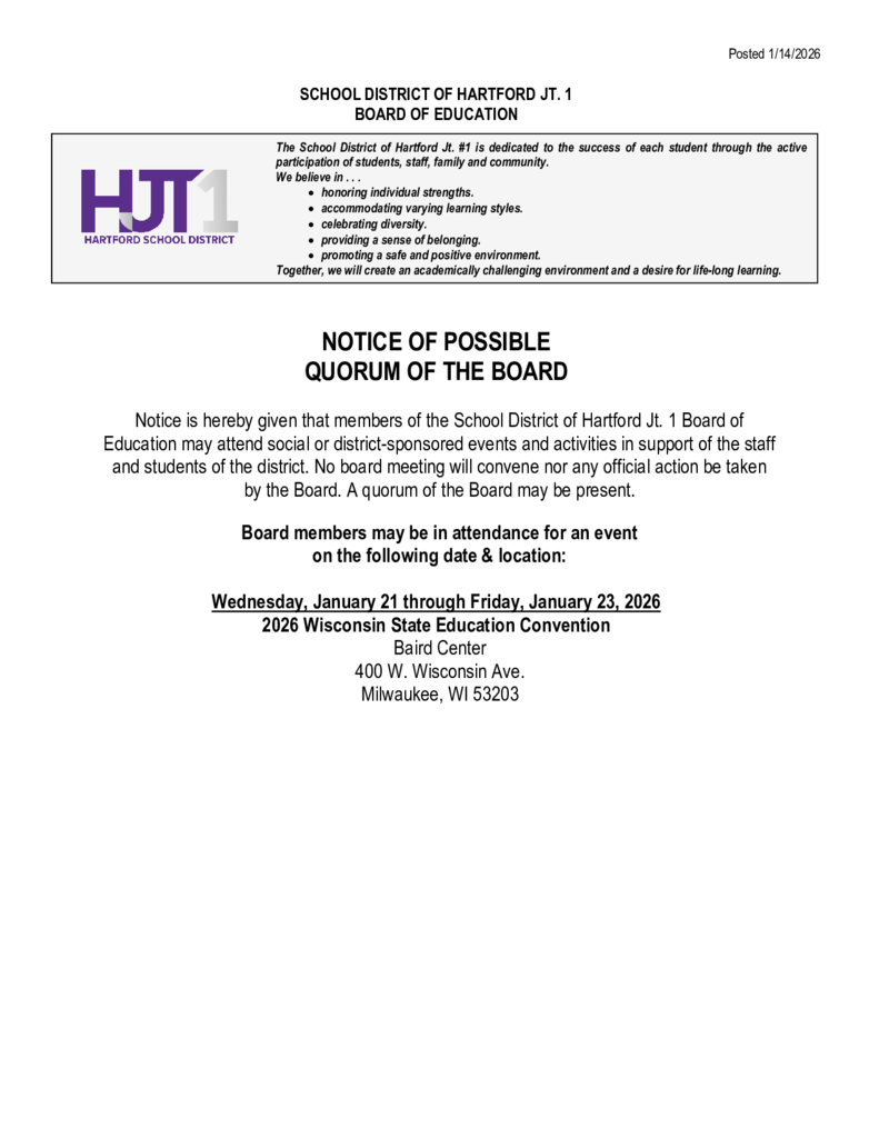 The School District of Hartford Jt. #1 is dedicated to the success of each student through the active participation of students, staff, family, and community.