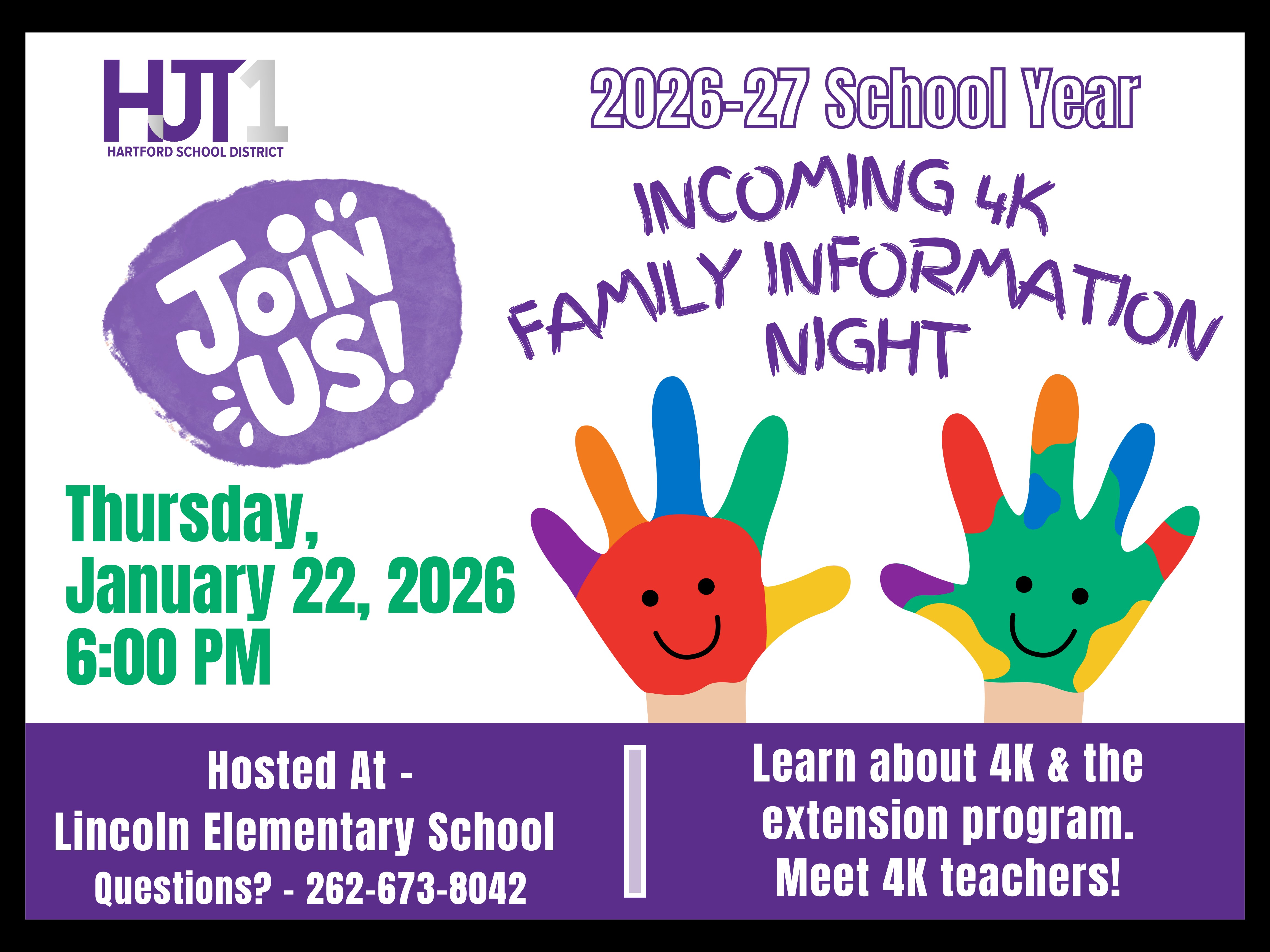 The Hartford Jt. #1 School District 4K Program runs five days a week for three hours. We offer extension care for students. Our teachers are certified by the state of Wisconsin and are employed by the School District of Hartford Jt. #1. Morning and afternoon sessions are available at Lincoln Elementary and Rossman Elementary. Please call Pupil Services at (262) 673-8042 if you have questions about 4K program registration or placement.